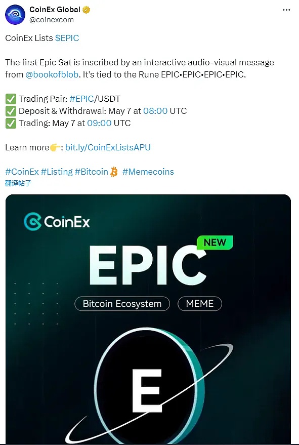 2024 年5月7日,CoinEx Global 发文宣布来自 Book of Blob 的交互式视听信息铭刻了第一个 Epic Sat 在 coinex 上市交易。它与符文 EPIC•EPIC•EPIC•EPIC 相关联。