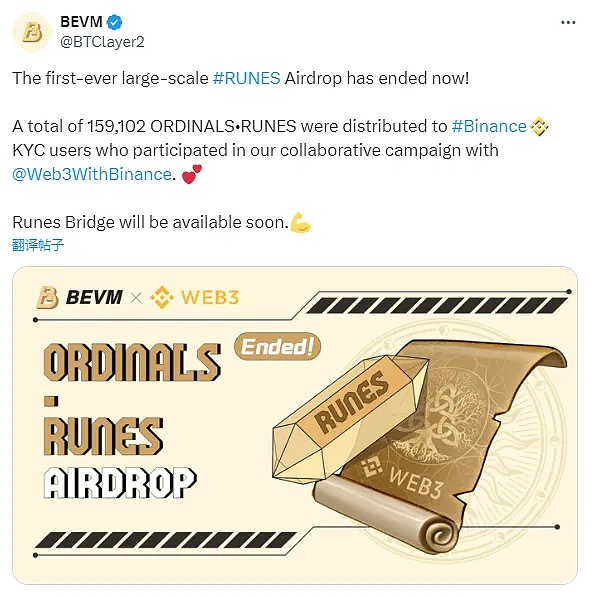 2、BEVM 宣布首次大规模 RUNES 空投现已结束!符文桥即将上线。