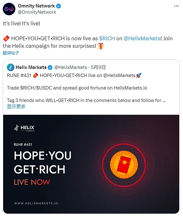 第431号符文?HOPE•YOU•GET•RICH 恭喜发财现已在 Helix Markets 上以 $RICH 的身份上线!