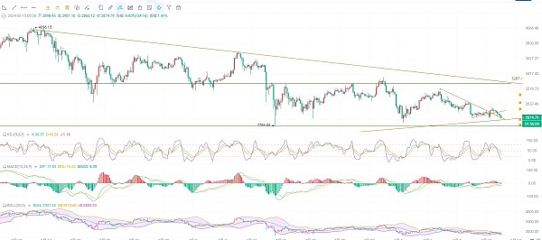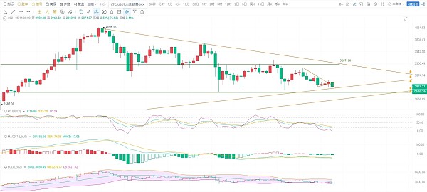 来看今日盘口,截止发稿前凌晨两点,以太坊现价2874,非常好的布局点刚好在趋势线附近并且出现了明确的建仓信号,EMA170趋势指标连续站立,预计会同昨日一样回到EMA160之上也就是2930上方,三角收低口比较常见的诱空指标,所以思路上布局多不变止损位也不会太远,所以就算行情出现逆转也只是小损出局也可以及时补救,布林带下轨支撑来到了2825,中轨压力位来到了3050,MACD缩量下行,DIF和DEA连续的多空交换现在开始向下扩散,也就是说在空闲跌破2900以后就开始向下扩散,短期内说明下方空间并不大,KDJ向下扩散加速找底,K线受阻趋势指标,