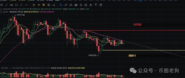 不过从图中可以看出,随着时间的推移,大饼日线级别30MA均线的高度正在随着价格和时间慢慢变低。短期的整理已经到了抉择方向的阶段。所以大饼短期还是要关注下方58811附近支撑位是否有效,只要大饼价格不跌破58811,那么行情就有机会反弹,反之如果价格跌破了58811那么行情大概率会再次试探下方更低价格的支撑位置。