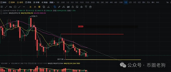 反观以太,从日线级别来看,以太的走势近段时间是弱于大饼的,这从以太的汇率就能看出,经过前段时间的反弹后,以太的价格因为美SEC对ETH的ETF打压,导致了以太近期价格持续走弱。以太和大饼一样,币价长期被日线级别30MA均线压制。目前币价依然处于中线阶段的下跌趋势中。不过从图中可以看出,目前以太近期最低价格在2817,并且在之前的下跌过程中币价多次插针此区域,说明2817一带的支撑还是有效的,所以短期币价只要不跌破2817那么以太就有机会再次反转短期的下跌趋势。3059依然是近期日线级别的强压力位。这也是以太近期为数不多尝试突破日线级别30MA均线的高点。
