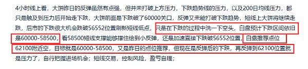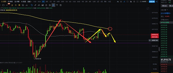 4小时线上看,大饼前面反弹后的下跌还未到位,整体来说还是属于震荡,没有走出破位,白盘有给到小反弹试探62100附近,反弹后行情白盘将继续走跌,下个下跌的目标位置依旧是先看60000下方,上方4小时还是有比较大的压力的,还有200日均线压力,想要去走出突破的机会不是很大,白盘交易上,昨日62100附近点位依旧有效,目标60000-58500区间,自行把握进场机会;短线交易,控制风险,盈亏自理;