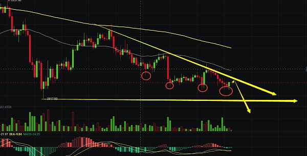 4小时线上看,以太的走势更弱,短线上低点也是在不断的往下,上方短线也形成了下跌趋势线,以太下一次发力走出下跌2817位置就保不住了,白盘交易上也是保持昨日思路,2910附近空依旧有效,目标先看2817破位,自行把握进场机会;短线交易,控制风险,盈亏自理;