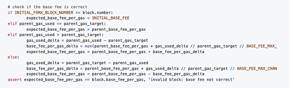 直到EIP-1559的提出与执行,Gas模型有个第一次迭代,EIP-1559时Vitalik等核心开发者在2019年4月13日提出的,并在2021年8月5日的London升级中被采用,该机制摒弃了拍卖机制,转而采用了一种Base fee和Priority fee的双定价模型,其中Base fee将根据父区块中已产生的gas消耗情况与一个浮动且递归的gas target之间的关系通过一个既定的数学模型定量计算,直观的效果为若上一个区块中gas使用情况超过了预定的gas target时,则上调base fee,若不及gas target,则下调base fee,这样做既可以比较好的反应供需关系,又可以使得对于合理gas的预测变得更加精准,不至于出现由于误操作导致的天价Gas Price,因为base fee的计算是直接由系统决定的而非用户自由指定。具体的代码如下: