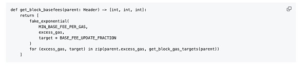其中MIN_BASE_FEE_PER_BLOB_GAS和BLOB_BASE_FEE_UPDATE_FRACTION为两个常量,而excess_blob_gas则由父区块中总的blob gas消耗于一个TARGET_BLOB_GAS_PER_BLOCK常量之间的差值来决定,当总的blob gas消耗超过目标值,即差值为正时,e**(excess_blob_gas / BLOB_BASE_FEE_UPDATE_FRACTION)大于1,则base_fee_per_blob_gas变大,反之则变小。