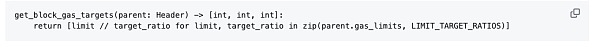 值得注意的是一个新的参数设计,LIMIT_TARGET_RATIOS=[2,2,4],其中LIMIT_TARGET_RATIOS[0]表示了执行操作类Gas的目标比率,LIMIT_TARGET_RATIOS[1]表示Blob data类Gas的目标比率,LIMIT_TARGET_RATIOS[2]表示calldata类Gas的目标比率,这个向量用于计算父区块中三类gas对应的的gas target值,计算逻辑如下,即分别使用LIMIT_TARGET_RATIOS对gas limit做整除操作: