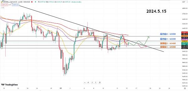 今日第一阻力位关注62200,第二阻力位在63000。当BTC价格突破第一阻力位时,师爷预计BTC有可能会回测到63000美元的区间。