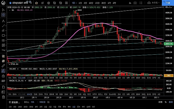 以太坊昨日走势与大饼一致呈震荡回落,最低至2862一线支撑反弹,恭喜跟上低多的朋友小幅获利,目前币价在2887附近运行,四小时级别k线九连阴后插针收阳,macd无量运行预计下跌的概率不大,有机会形成底背离结构走出一波反弹,上方关注2930阻力区域,站稳会再次测试3000关口,日线级别多次插针至2860附近可见支撑挺强,短期整体处于底部震荡,目前走势偏弱不排除破位新低的可能,长线继续持币观望,等待cpi公布,若再次下跌给机会可逢低买入,后市依旧看好,上方压制2930-3000,下方支撑,2860-2800