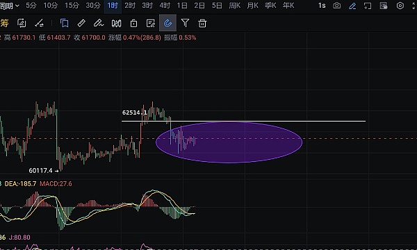 大饼。昨日早盘再次走弱,以6.3关口起点作为二次起跌,日内小周期连阴格局愈发走强,晚间直至探低60900附近后才有所止泻,6万关口愈发临近(破位无疑)。目前小时图来看,币价反复承压中轨下方横盘整理,早盘阴阳转换结构有所加固,BOLL通道再次收口有所放缓,短期修补动机明显,附图方面开始向上拐头发散,但MACD 快慢线持续给到金叉即粘合的滞后节奏,趋势上大的拉升较为乏力。今日操作上,李隆建议围绕上轨附近的防守,白盘修补后分批去空一次,进场切记做好分批风控计划。