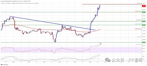 Solana 在 150 美元阻力位上方开始新一轮上涨。SOL 价格上涨近 15%,如果突破 165 美元阻力位,可能会继续上涨。