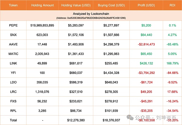 这只鲸鱼不是交易员,而是长期持有代币进行投资。他总共购买了10种代币,从未出售过。Lookonchain补充称,这只鲸鱼净亏损610万美元,仅有5种代币盈利,胜率为50%。