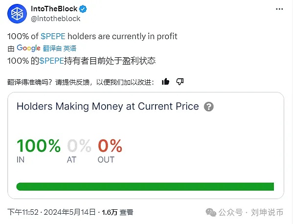 随着Pepe Coin价格创下历史新高,投资者纷纷大量买入。IntoTheBlock数据显示,PEPE交易者目前100%盈利,这表明鲸鱼抛售的可能性很高。