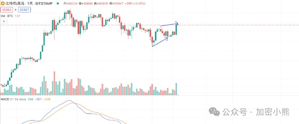 我们可以看到前两天提出的所有待验证因素均已实现,并且指向了市场的看涨态势。因此,我们对未来的行情应该持乐观态度,因为我们已经度过了最艰难的时刻。在短期内,我们将密切关注6.55万美金附近的情况,希望市场能够在这一水平附近稳定,并且最好能够在这里进行一段时间的震荡,为下一波上涨打下坚实基础。