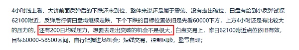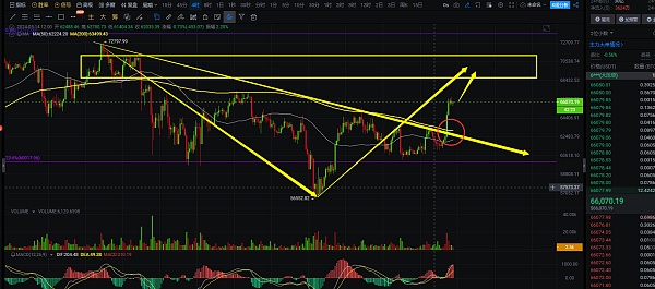 4小时线上看,大饼的走势是突破了下跌趋势,以及200日均线压力,突破行情就是伴随着大阳线或者大阴线的,因为走出突破是需要一定的力量,目前大饼走出突破,那这波反弹就将还未到顶,这波反弹的有效压力位在69400附近,还有3000左右的空间,需到达这里后才能再去根据走势看空单是否能做布局,白盘交易上,做回调多,前面的压力变为支撑,推荐点位在65000附近,如给不到,行情4小时站上66700位置,也就是这波拉升高点,也是可以直接去追涨到69000附近的,自行把握进场机会;短线交易,控制风险,盈亏自理;