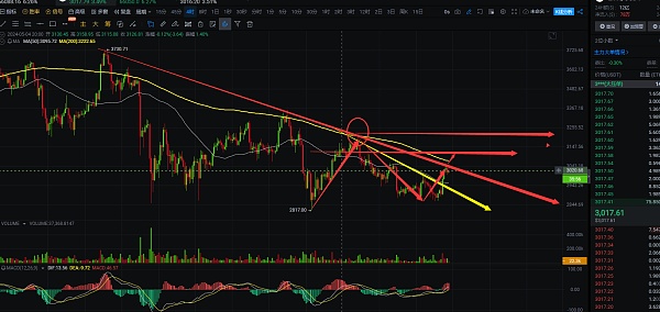 4小时线上看以太的走势还是比较弱,跟不上大饼的脚步了,这波以太的反弹基本上属于是大饼带动,以太也只是打破了短线下跌趋势,也就是昨天我们说的下跌趋势线,长线的还未打破,目前承压,以太这波反弹的有效压力位在3150附近,到达该位置后关注大饼反弹力度,如大饼到达69000附近,那以太也将迎来做空机会,如大饼还未到压力位置,以太就需要关注短线3221高点破位了,破位后行情将往3380附近去靠,白盘推荐点位3000附近,目标看3150附近,自行把握进场机会;短线交易,控制风险,盈亏自理;