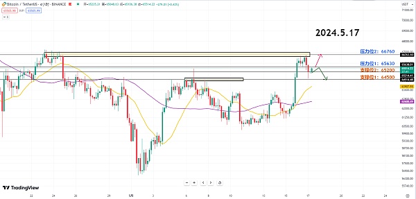 短期第一阻力参考65630, 第二阻力参考66760。当在短期内价格突破第一阻力时,可维持看多的观点。