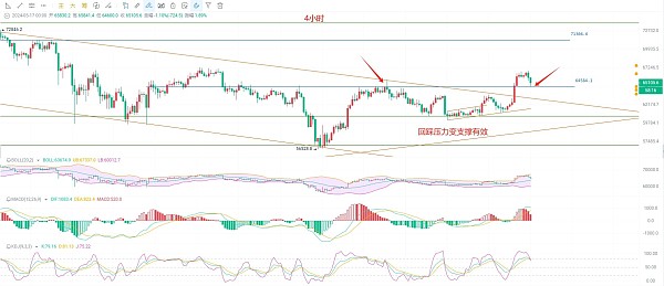 四小时K线直接回踩EMA15趋势指标支撑位64600,支撑有效,EMA移动平滑指数整组上行开始交替扩散,多头趋势不变,思路上回踩继续多,KDJ向下开口,MACD放量下行,DIF和DEA高位向下收口,但是布林带确背离上行开口,K线目前从上轨回落到下轨之上,那么思路上综合各项指标来判断做几点布局
