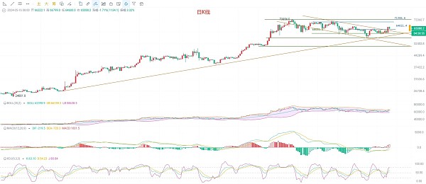 来看目前的盘口,现在是凌晨三点,比特币现价65000附近,日K线目前最高点66800,最低点来到了64600,EMA整体趋势偏多,KDJ向上开口空间还没有走完,MACD放量增筹依旧在延续,DIF和DEA低位向上拉开身位开始冲击0轴线,加上布林带前天的日K线破位上轨压力位66200之后,今日回踩进入布林带内部形成一个良性循环,既然布林带已经向上开口,那么趋势上还是多头不变,