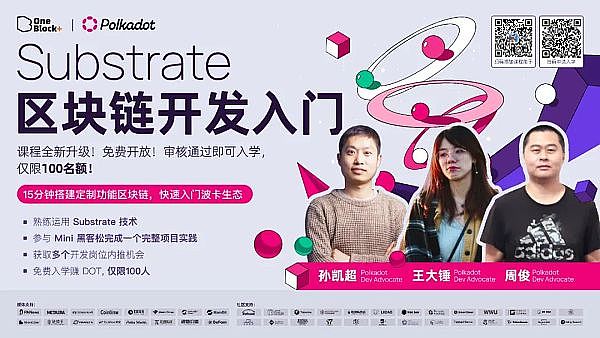 【Substrate 区块链开发入门】第十五期课程将在 6 月上旬开课,课程实现全新升级,免费开放!审核通过即可入学,仅限 100 名额!只要你想 15 分钟搭建定制功能区块链,快速入门波卡生态,就赶快加入我们。