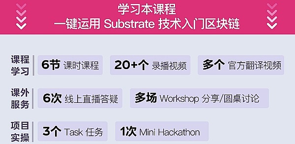 这门面向新人入门的技术课程,将围绕区块链基础技术、Rust/Substrate 基本技巧等训练,让学员在学习过程中能能够实现所有区块链相关技术及 Substrate 开发技能举一反三,掌握更多开发实战本领。