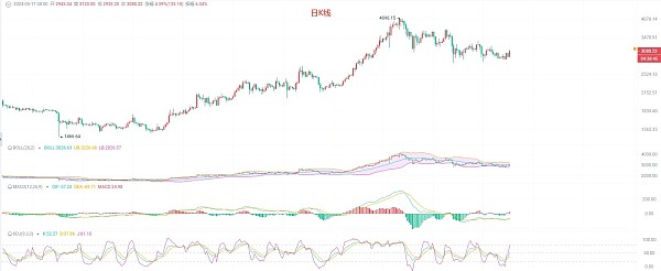 来看今日盘口,截止发稿前凌晨三点多,以太坊现价3080 ,日K线和预期的差不多站立EMA趋势指标150以后就开始拉伸现在冲击EMA趋势指标压力最高点3130,受阻,关注昨日开盘价3030附近的支撑,毕竟EMA开始收缩了,这意味着新的清算正在酝酿,KDJ向上开口扩散还没有走完,MACD底部背离持续时间太久,放量增筹量能暴增,DIF和DEA向上抬头扩散,日K线也破了布林带中规3030的压力,值得关注的是布林带顶部压力位开始下移已经来到了3220,收缩行情意味着高位盘整,