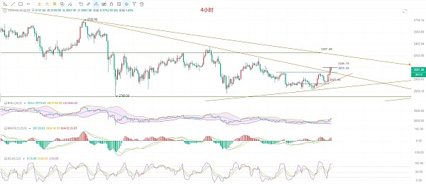 四小时K线受阻3120这是目前市场上正常的表现趋势,如果直接破了3120拉伸到3250那才是不正常的,必须要有一波回踩才是良性循环,目前四小时K线已经回踩EMA趋势指标170也就是3070附近,但是还不够,EMA15的快线还没有抵达K线附近,所以回踩还会继续,下方关注3050和3030区间的支撑,这个时候EMA15的快线基本都已经来到了K线位置,预计会在这个位置附近触发反弹机制,KDJ上行扩散受阻3120以后回落就可以看出上方短期内还有较强的阻力,MACD放量增筹但是DIF和DEA并没有离开量能指标,K线破了布林带上轨以后又回到了布林通道内,防守点可以关注布林带中规2975这个位置,思路上以回踩多为主,高空为辅
