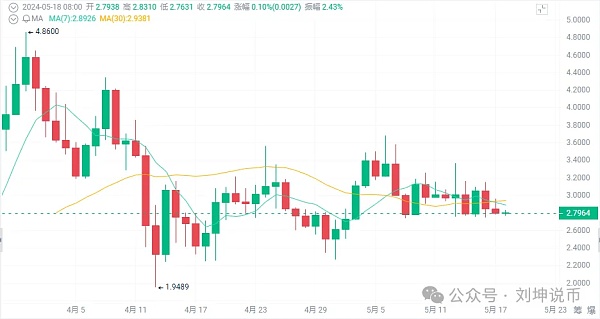过去一周,Dogwifhat的价格下跌了5.06%,反映出持续的看跌压力。目前,该代币的价格比2024年3月31日创下的历史高点4.85美元低了41.97%。价格和交易量的显著下降凸显了市场对Dogwifhat代币热情的减弱。