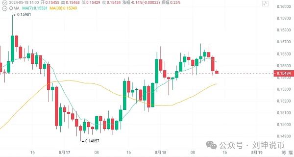 截至目前,狗狗币的价格在过去24小时内上涨了3.65%,目前交易价格为0.15456美元。其24小时低点和高点分别为0.14857美元和0.15931美元。