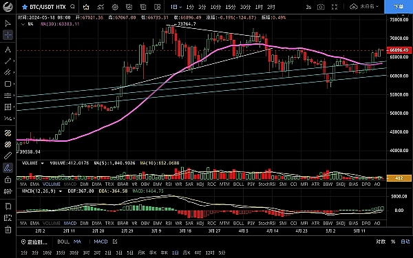 大饼昨日一路反弹上行,最高触及67433一线受阻,走势与思路一致恭喜跟上的朋友多单获利,目前币价在66860附近运行,四小时级别短期行情上涨受阻,k线三连阴回落,macd多头缩量双线聚拢有死叉迹象,目前走势偏空但注意ma7支撑能否破位,回踩不破短线仍是多头趋势还有上攻的可能,日线级别来看多头依然强势,67000附近压力不大,随时有冲破的情况,一旦站稳下个位置关注70000附近,思路建议回踩低多为主,上方压制67800-68300,下方支撑66500-65800