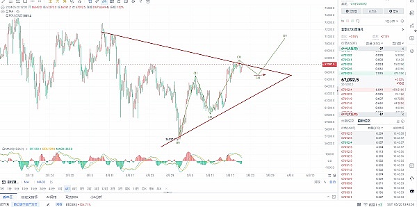 比特币日线级别K线连续4次上攻上方67200-67400阻力位,从波浪理论来看的话,大概率是会有一波回踩的,这一波回踩的点位大约65700-65000这个区间,如果回踩下去进行调整走出5浪趋势,那么可以在这个区间分批看多,后期就会有概率去到59000-70000这两个位置,另外一种走势就是高位震荡进行强势拉升再去进行回踩,短周期我们下方关注63500-63000这是多军的一个防守位,空军的防守位置关注67400-68000,有概率会去碰一下68000这个位置进行回落,今天日内操作思路,可以在67600-68000区间去把握一波回调的利润,激进的币友可以在67200建仓,目标1000-1500个点如果回踩的力度不错,那么可以看波浪理论的回调位置65700附近。止损位置68653,如果能回落到我65700附近,那么可以在这个位置去分批多单进场,利润和风控大家自行把握