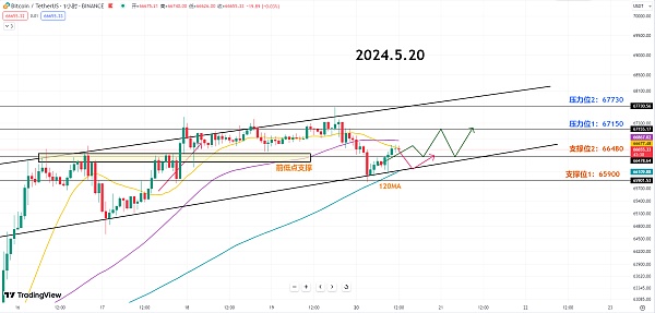 第一阻力参考67150,第二阻力参考67730。首先第一阻力也是前高点67150,所以需要观察下方支撑的企稳情况,并关注突破阻力后的回测。