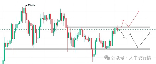 从比特币的短期走势来看,这一波上涨多头先是放量,然后缩量,这说明多头力量开始减弱。空头的量能也是一波比一波小,整体的多空都在缩量,表现的都不强势,从图中可以看出来,几次上冲压力位都没有上去,说明上方遇见了压力。比特币这波回到了67000美金,从盘面的走势来看短期会有回调,但下方重重支撑,回调的力度不会太大。2021年的5.19是牛市的末期,但当下是牛市,不能拿来作为比较,所以我一直的观点就是比特币大跌的可能性不大,盘面也看不出来要大跌的迹象。