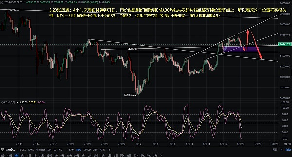 4小时来看布林通道开口,币价也是刚好回撤到EMA30均线与双趋势线底部支撑位置节点上,所以看来这个位置确实很关键,KDJ三线中J值低于0值小于k值33,D值52,说明底部空间等待k,d值走完,J值才能形成拐头;