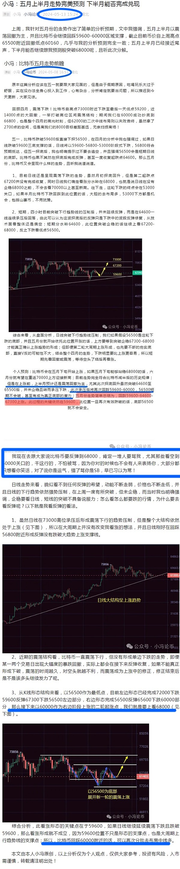 今天一好友找我吐槽,说520又要给老婆准备礼物,算上2月14和七夕,一年三个情人节,辛辛苦苦攒的私房钱全给掏空了。我只能安慰他说,反正你的钱也都是她的,你花钱给你老婆买礼物,相当于她自己用钱给自己买,至于你的私房钱,本来在你老婆那里属于违规占有,为她花至少她不生气,要是为自己花被你老婆发现免不了一顿毒打。是的,我朋友是妻管严,但也正是因为她老婆对他的约束,才让他在事业上小有成就,所以我觉得他给她老婆送多少礼物都是应该的,因为他老婆就是他这辈子最大的财富。 那么今天正值520,我在想我有什么办法给一直关注我的朋友们送上一份礼物呢?想来想去,还是再写一篇分析送给大家,这也才是最有用最能照顾所有人的礼物吧;话不多少,直接开干! 本月,我总共更新了两篇文章,这两篇分析基本完美预测了本月截止目前所有的走势;上旬我预测比特币先震荡回撤59600-60000区域回踩支撑再反弹,中旬明确看涨68000,并提示60000关口附近可布局中线多,上周最高触及67800,基本跟我们的目标68000不差丝毫。那么五月下旬,比特币会怎么走,还能不能按照我的预测兑现,且听这回分解。