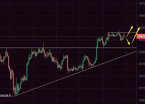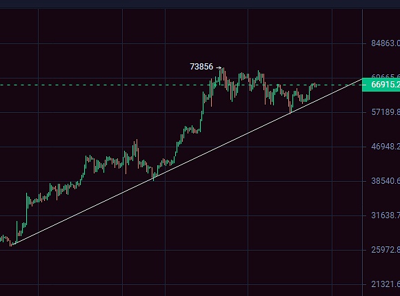 2、短期来看,日线分水岭68000,此位置是我反复强调的位置,昨日也刚好触及并承压回调2000点,说明此位置的阻力是有效的,如果从阶段去分解,站稳68000,是比特币继续向上测试72000-73000顶部阻力的首要条件,72000附近从结构上看实际已经形成三顶压制,所以多头想要刷新历史新高实际上难度较大。但在牛市走势中,不存在顶部,更不存在新高。 3、短线来看,67500-68000这个区域会有压制,如果出现回撤也不要意外,回撤支撑点极限在64500-65000,为什么说极限点,因为如果回撤跌破64500的话,那短期的上涨结构就要破了,就要重新思考短期内能不能再去多了,所以,如果高位承压回撤65000附近的话,可以继续布局短中线多,看68000-72000。