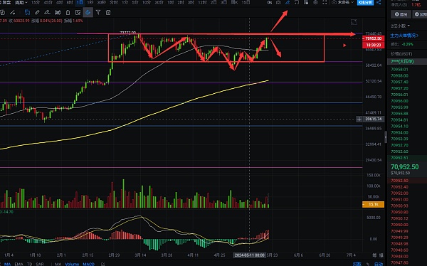 日线图上看,大饼目前走势又再度回到前面的高位震荡区间,跌破60000位置后并未延续空单的下跌,前面打破下跌趋势就是为了拉盘,只是在拉盘的过程中需要洗盘和吸筹,就在底部一直走震荡,也就是这几天的行情,直到昨晚行情开始拉升,直接到达前面高点附近,不过前高73777位置是有一定的压力的,前面几次到达附近后都没有去突破,这波上涨我们也暂时认定压力有效,不去看破位,4小时线上大饼到达短线高点72797附近收收一根高位的十字星,短线上我认为大饼还是需要先走一波回调,这里我们不去看破位,如果破位了,那我们再去根据走势做新的布局,大饼回调点位预计在68500附近能不能到达并跌破,如果到达后跌破,行情将继续回调,反之在68500附近收针,行情将继续反弹,短线上个人建议可轻仓布局空,推荐点位71300附近,昨晚高点破位就没必要继续持有了,目标就看68500附近,自行把握进场机会;短线交易,控制风险,盈亏自理;