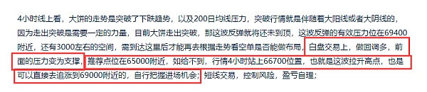 昨晚大饼以太纷纷拉盘,快速上涨,以太前面走的比较慢,但昨晚的反弹直接追上大饼的步骤,大饼从66000附近一直上涨到71979位置,上涨6000个点左右,以太从3050附近,直接上涨到3721位置,直线上涨600多个点,前面一篇文章我们做了预测,大饼回到多头趋势中,预测点位大饼是69000附近,不管是回调到65000附近进的,还是突破66700进的,都给到了不错的利润空间,以太也是一样,只不过没想到以太突破后会到达3700去,我们预测高点是3380附近,就算是3380附近离场,也是有不错的利润的,因为近期行情震荡为主,并且行情也没有打破趋势,就没有去炒现饭,写那么多文章,最后恭喜跟上战神策略的朋友获利一大波利润;