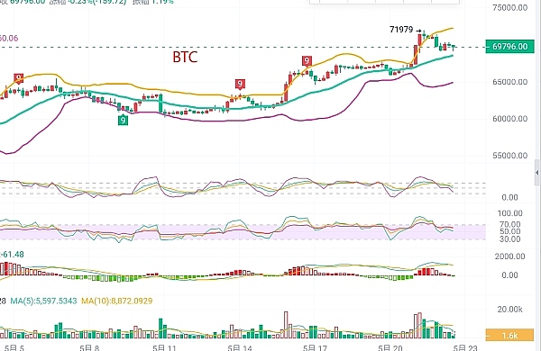 最近几个小时内,价格出现了从66010上升至70222.3的强劲反弹。在05月21日08:00到09:00期间,最高价达到72132.8,显示买方力量较强。今日7点这一周期的K线为短实体,表明开盘后价格波动不大,市场目前处于观望状态。