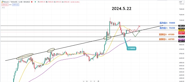 第一支撑位参考69300美元,第二支撑位68700美元。如果价格跌破了第一支撑的话师爷认为则会有进一步下跌的可能性,由于市场没有重大利空消息,因此急跌可视为进场做多的机会。