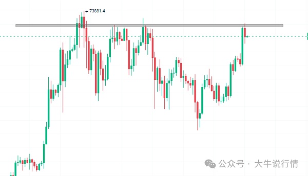 说回比特币的行情,从日K线看,72000-73000一线是左侧前高的一个重要的阻力区间,这一带回撤调整的风险依然存在,虽然前几次都触及走回撤,一而再再而三,既然这次没有直接拉升破位,那么如果后期调整完毕再次冲高,破位的概率就会加大,所以现在需要等行情,这也是内部多单清仓的原因。