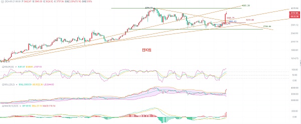 截止发稿前凌晨两点多,以太坊现价3740附近,日K线最高已经到了2845,连续两天从3050到2845,这样的行情历史上也少有,EMA趋势指标开始上行抬头,快线EMA15还在发力,预计还需要几天的时间才会为K线提供新的支撑点,MACD放量增筹持续,DIF和DEA形成两极分化,布林带开口以后K线破了上轨,KDJ受阻2850以后回落了100多点整体思路上高位横盘,