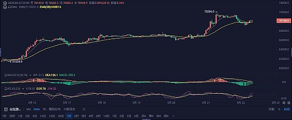 K线形态信号:最近几个小时内,价格出现了从66010上升至70222.3的强劲反弹。在05月21日08:00到09:00期间,最高价达到72132.8,显示买方力量较强。05月22日07:00这一周期的K线为短实体,表明开盘后价格波动不大,市场可能处于观望状态。