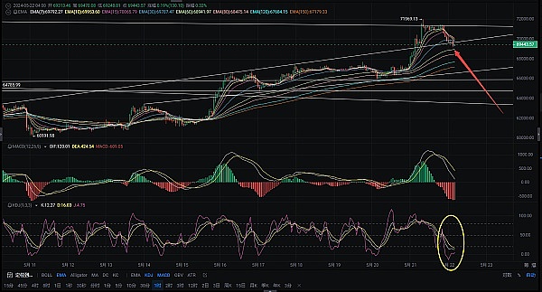日线级别来看币价在顶部趋势线位置已经下行当前底部第一趋势线支撑位置,KDJ三线顶部向下拐头有意形成交叉,MACD中上方能量放量平衡,DIF与DEA并没有明显的收口迹象;