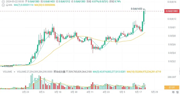 今天(5 月 22 日),PEPE 的价格表现显示在过去 24 小时内上涨了 21.82%,达到 0.00001383 美元。在这段时间内,该代币的价格波动范围从 0.00001094 美元到 0.00001422 美元。