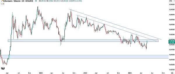 该分析师补充指出,ETH/BTC 目前接近之前的盘整水平。如果它能保持在0.055以上,那么山寨币在短期内可能会表现良好。然而,如果跌破这一水平,可能会引发山寨币的短期下行趋势。该分析师预测,ETH/BTC 将在第二季度触底,并可能导致第三季度和第四季度出现重大波动。