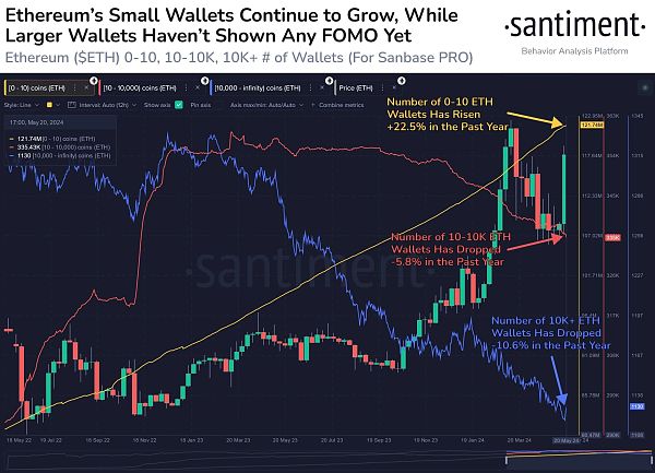 链上数据提供商 Santiment 披露称,持有 10 个或更少 ETH 的小型以太坊钱包数量已达到历史最高水平,达到了1.2174亿个。相比之下,持有 10 至 10,000 个 ETH 的“智能货币”钱包在过去一年中减少了5.8%,而持有 10,000 个以上 ETH 的大型鲸鱼钱包则减少了10.6%。