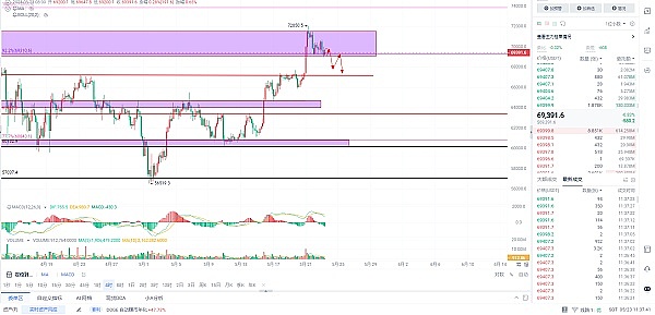 比特币受到老二消息面的刺激突破到72000距离新高相邻的位置,然而当利好消息面消化差不多的时候,行情走势也进入了回踩需求,毕竟只是消息面的刺激才带动起来的走势,这一波走势就像弹簧一样拉的差不多拉不动之后,那么肯定是需要进行压缩,也就是回调,不回调那么如何更好的去反弹。