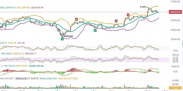 个人对大饼历史走势的分析,因为大饼减半前夕已经新高,相对的获利盘还是很多的,那么就更需要时间来去消化这些获利盘,待完成充分的换手后,才能够去到更高的位置,那么大饼势必也会在一个宽幅的区间震荡一段时间,短期MA(MA5和MA10)均线出现拐头迹象,这可能意味着价格调整即将结束,新一轮的上涨即将开始。目前4小时图均线死叉,MACD有背离,预计今天还会继续回落,所为我们继续执行我们的策略就好。