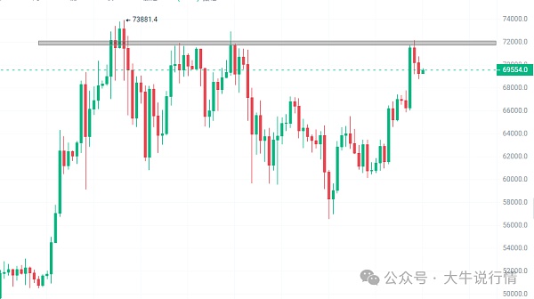 大饼最高已经来到了72000附近,距离历史高位也不过就2000个点的的涨幅,也就是两三个点的是事情,所以我认为大饼突破新高也是大概库的事情,另外按照个人对大饼历史走势的分析,因为大饼减半前夕已经新高,相对的获利盘还是很多的,那么就更需要时间来去消化这些获利盘,待完成充分的换手后,才能够去到更高的位置,那么大饼势必也会在一个宽幅的区间震荡一段时间,震荡区间个人预计会在60000美金-80000美金的样子!